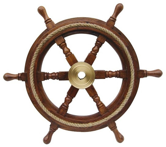 Dísz kormánykerék fából, közepén réz betéttel, kenderkötél díszítéssel. Hajós stílusú dísztárgy.