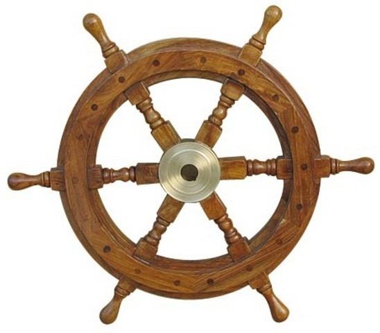 Dísz kormánykerék fából, közepén réz betéttel. Hajós stílusú dísztárgy.